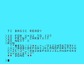 The TI 99/4A was another early home computer. Its character set has the rare inclusion of small capitals instead of lower-case letters; this may have been a compromise decision as the character cells are not deep enough for descenders. The small caps are generally well-executed and perfectly match the full capitals.