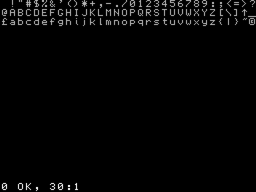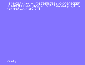 This obscure home computer has one of the worst character sets I’ve seen (the ampersand & really does sit below the baseline; that wasn’t a mistake on my part!). There would have been plenty of room for lower-case letters if the set didn't have duplicate glyphs in different colours, multiple variations of the COMX logo and other useless pseudo-graphic characters. What’s more, the RCA CDP1870 video chip supports character cells 9 dots high, which would have allowed for lower-case with true descenders.