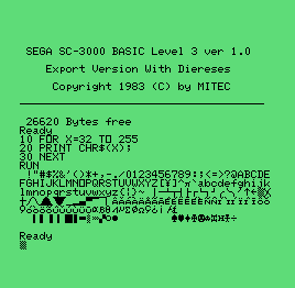 The SC-3000 was a computer version of Sega’s first game console, the SG-1000. Like the SG-1000 but rarely for home computers, it has no built-in ROM for firmware, instead relying on plug-in cartridges. This character set belongs to the BASIC Level III cartridge.